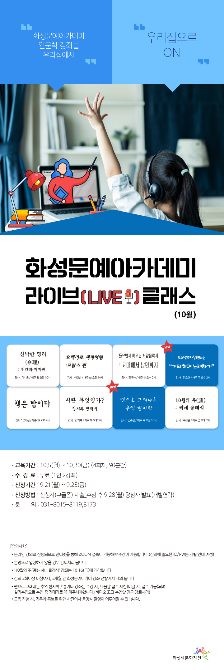 [화성문예아카데미] 우리집으로 ON! 10월 라이브클래스 안내 작성자 관리자 작성일 2020년 9월 21일 9시 39분 18초 조회 980 문예아카데미_라이브클래스_홈페이지공지사항 (2).jpg [ Size : 532.05KB, Down : 851 ] 미리보기 다운로드 10월 라이브클래스 접수하러가기 ☞ https://bit.ly/3hONn6L 목록보기