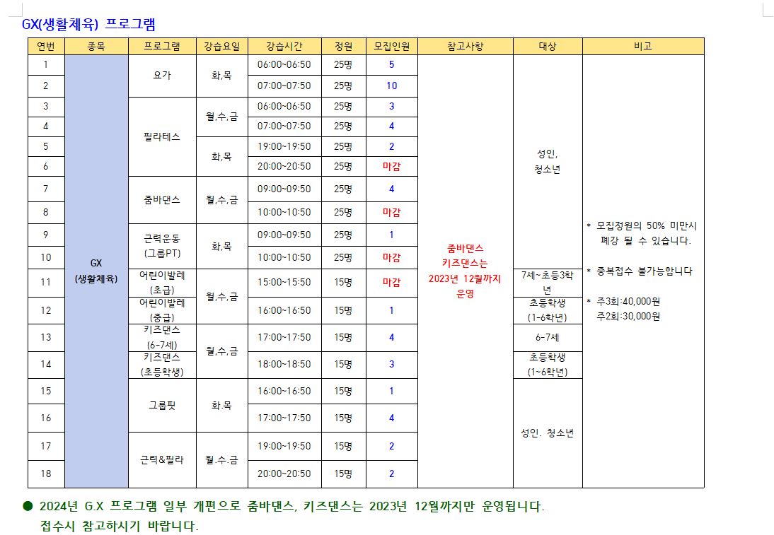 ● 2024년 G.X 프로그램 일부 개편으로 줌바댄스, 키즈댄스는 2023년 12월까지만 운영됩니다.