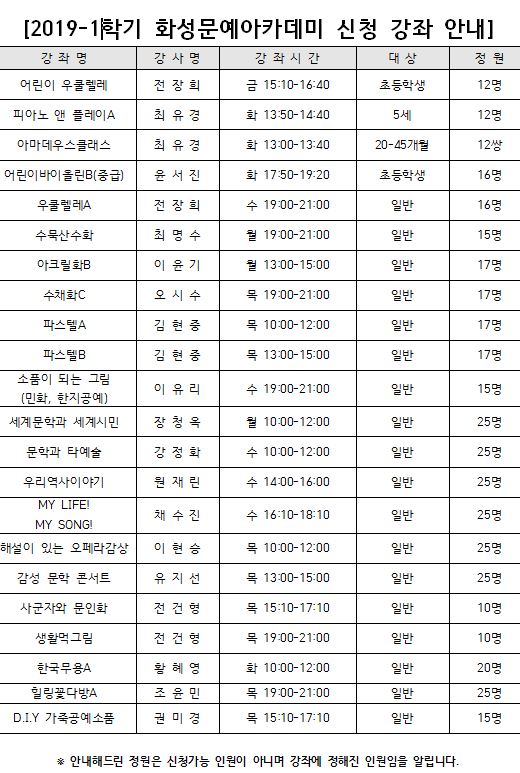 [화성문예아카데미]2019-1학기 수강신청 가능 강좌 안내입니다.