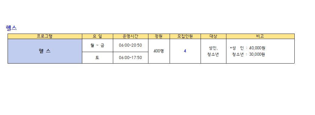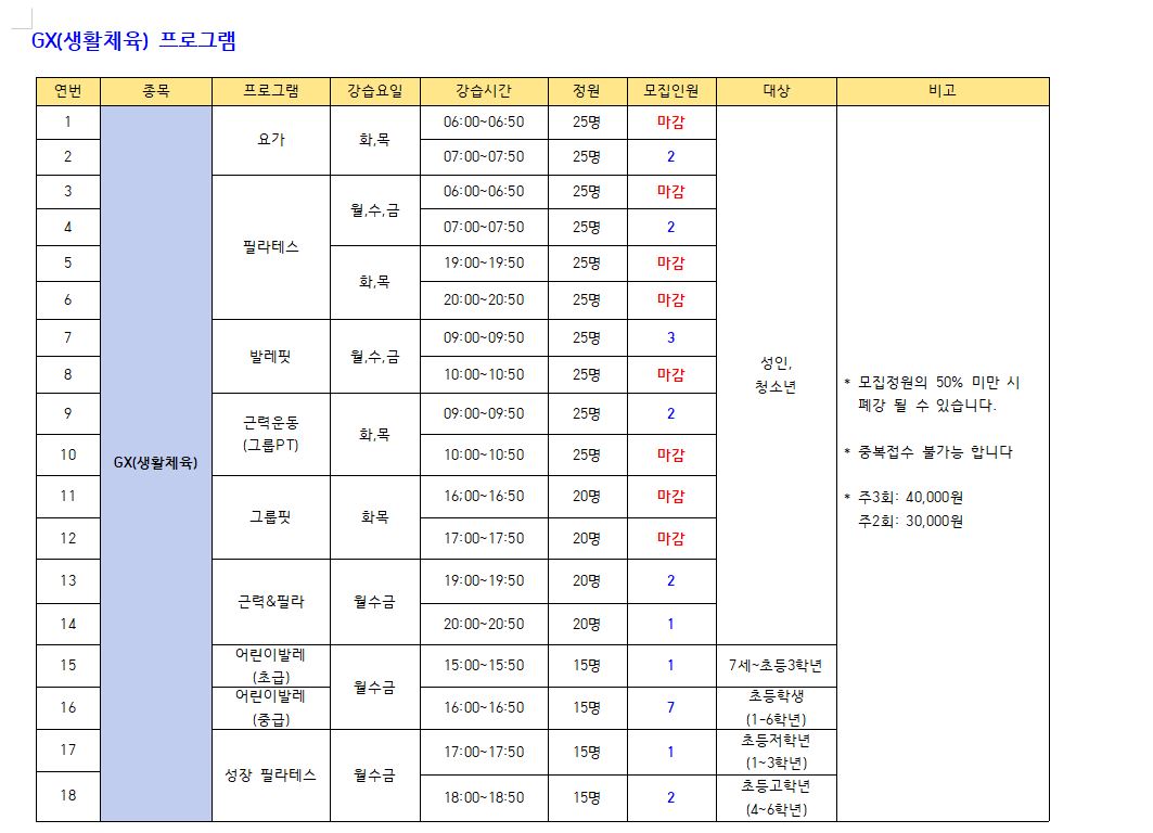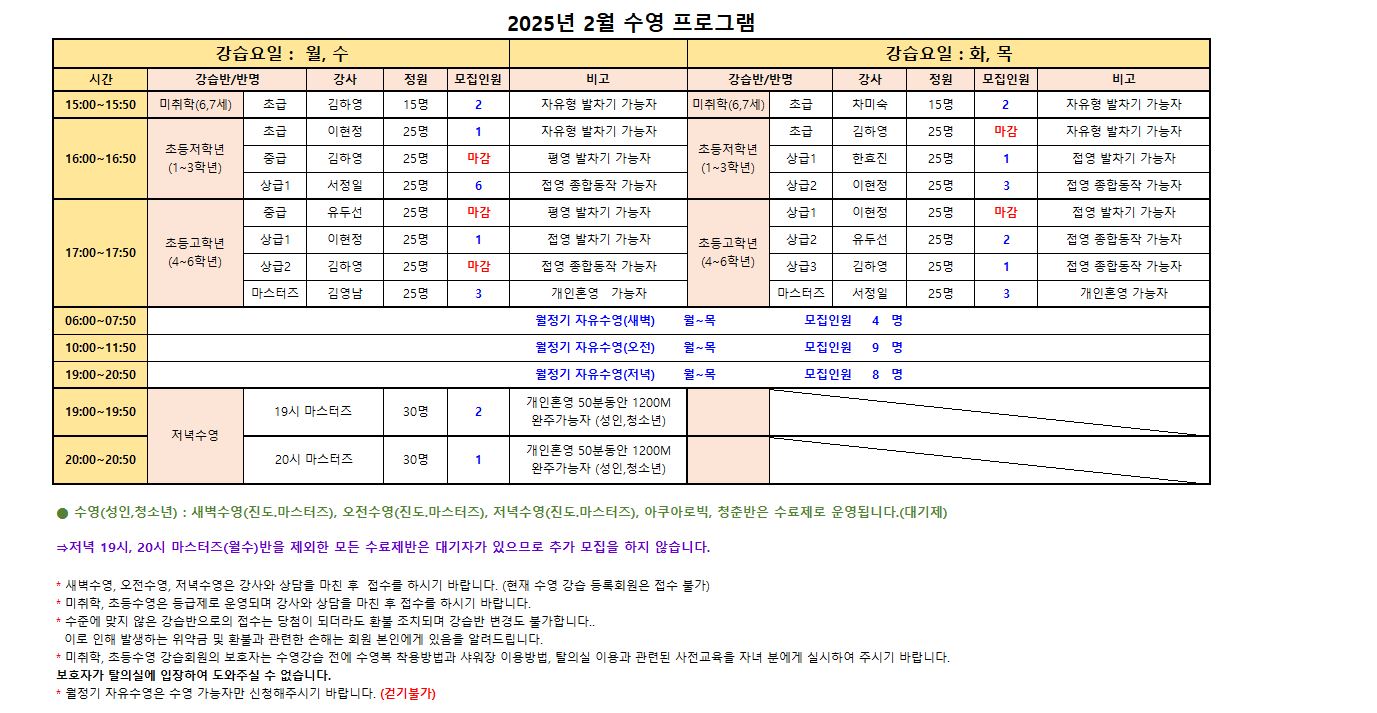 ※수영(성인,청소년) : 새벽수영(진도.마스터즈), 오전수영(진도.마스터즈), 저녁수영(진도.마스터즈), 아쿠아로빅, 청춘반은