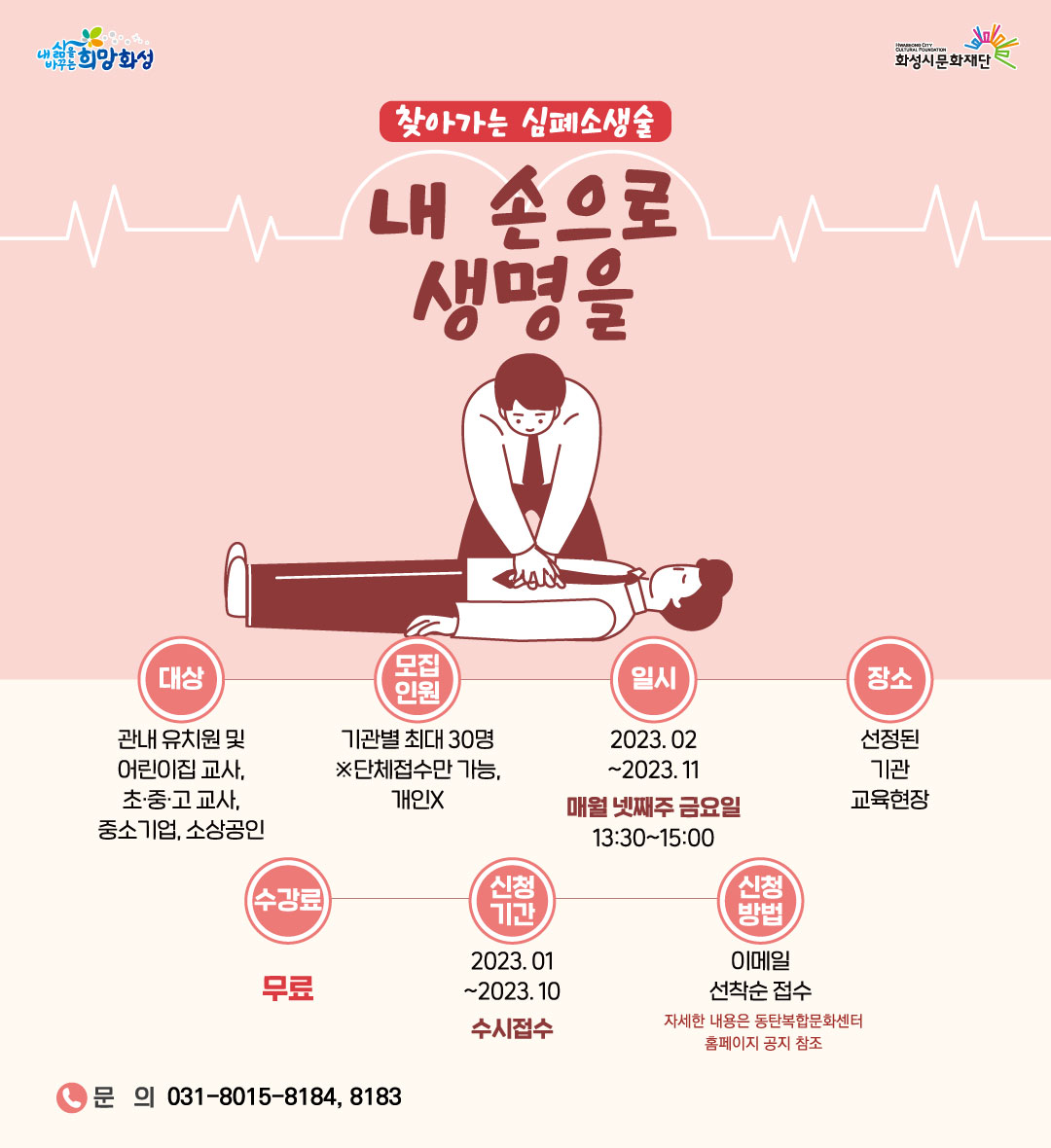 ※화성시 소재 직장 재직자분들의 생활안전역량 향상에 도움이 되고자 사회공헌사업으로 심폐소생술교육을 무료로 실시합니다.