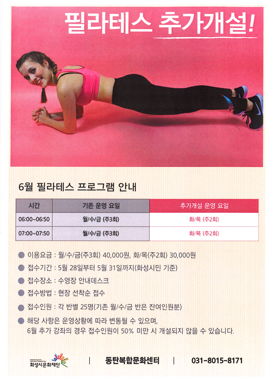 6월 필라테스 프로그램 추가 개설 안내 작성자 관리자 작성일 2018년 5월 10일 16시 35분 19초 조회 3,351 필라테스추가개설_내용.jpg [ Size : 312.5KB, Down : 3,976 ] 미리보기 다운로드 목록보기