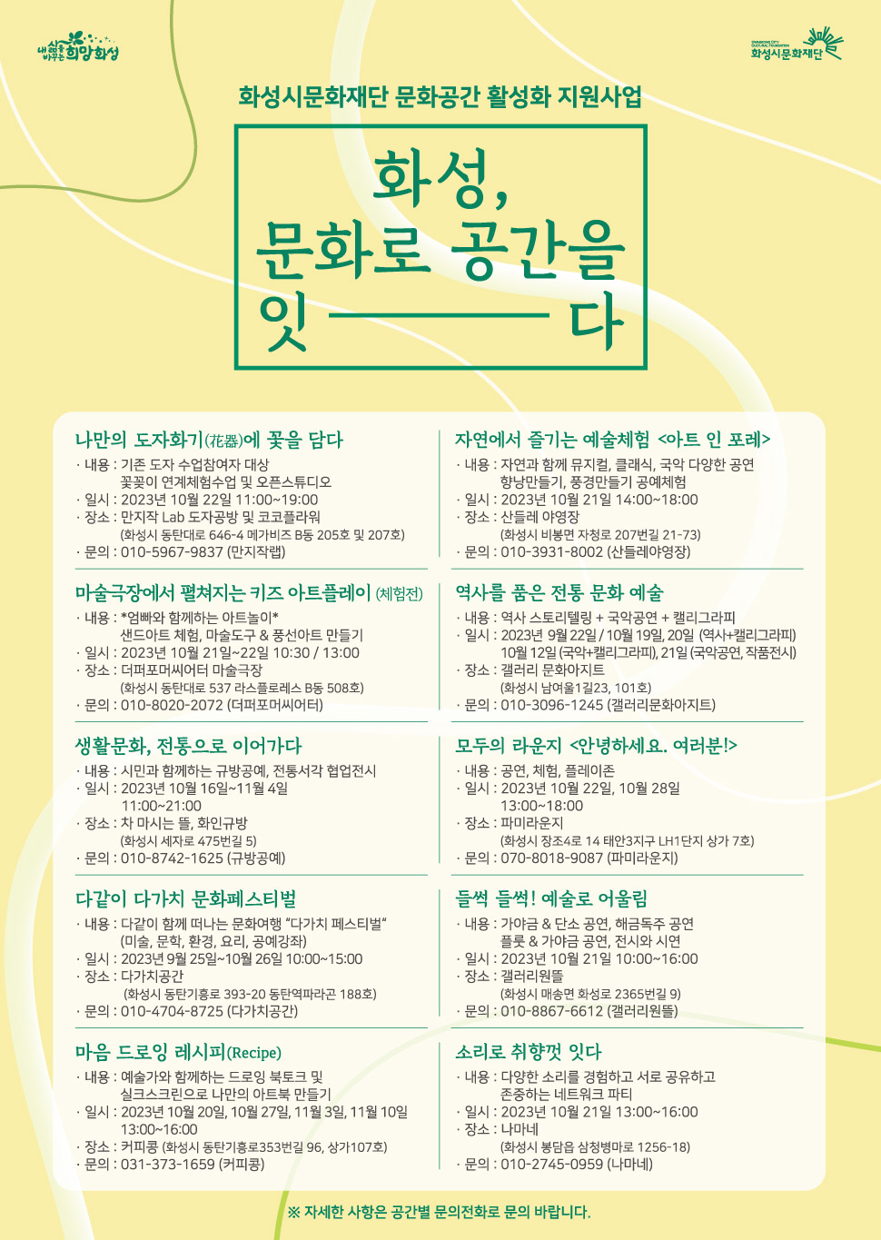 <화성시 문화공간 활성화 지원사업> 문화로 공간을 잇-다 작성자 관리자 작성일 2023년 9월 27일 11시 43분 15초 조회 348 문화공간 활성화 지원사업 포스터.jpg [ Size : 300.47KB, Down : 239 ] 미리보기 다운로드 문화공간 활성화 지원사업 포스터 목록보기
