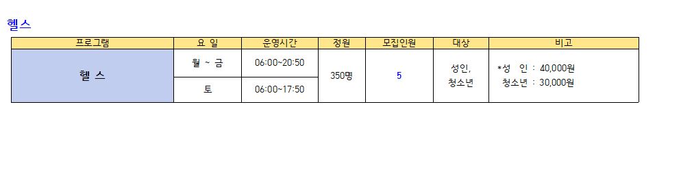 ● 수영(성인,청소년) : 새벽수영( 진도.마스터즈), 오전수영(진도.마스터즈), 저녁수영(진도.마스터즈), 아쿠아로빅, 청춘반은