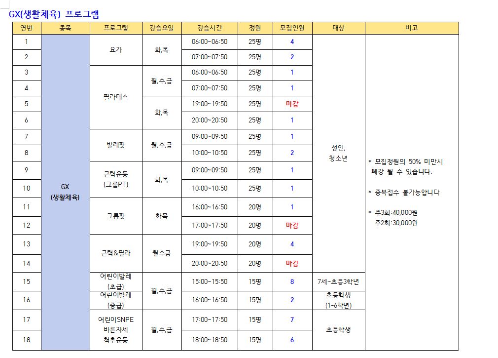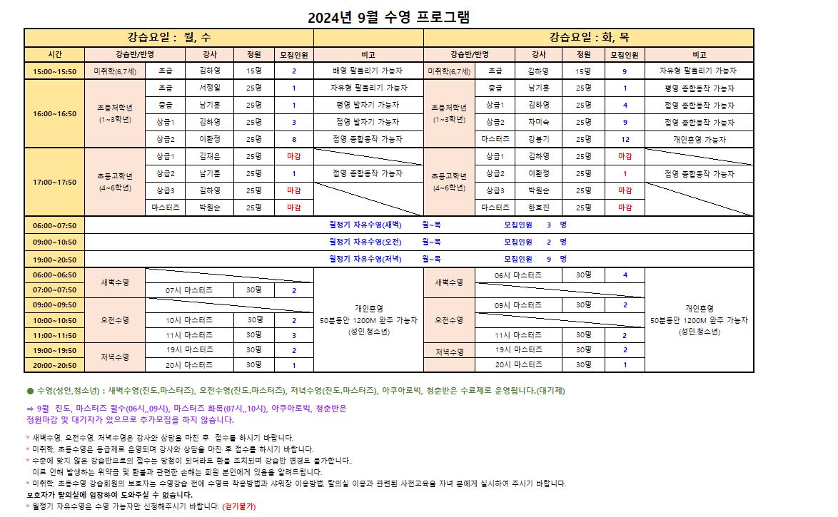 ⇒ 9월 진도, 마스터즈 월수(06시,09시), 마스터즈 화목(07시,10시), 아쿠아로빅, 청춘반은