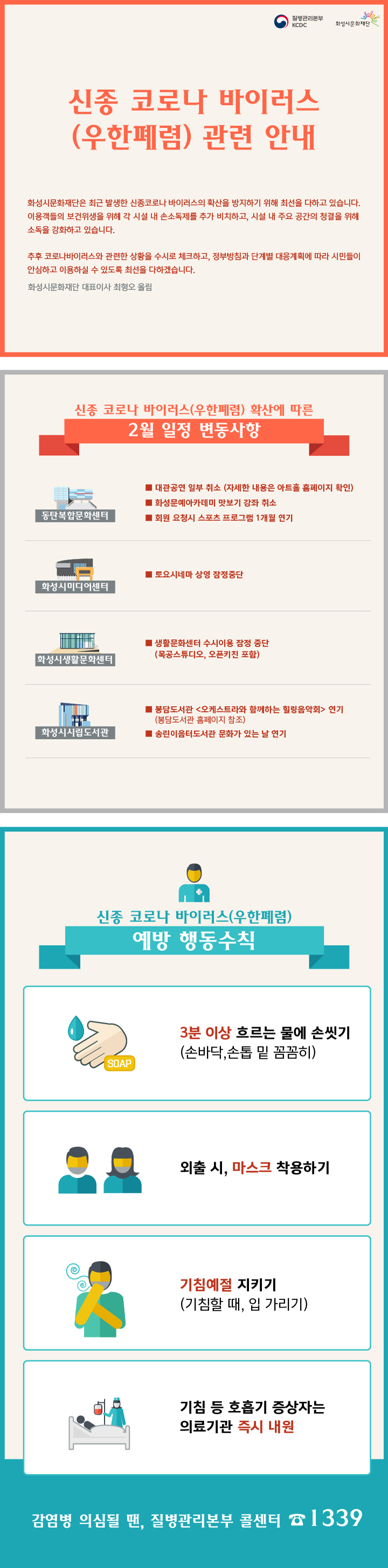 [공지] 신종 코로나 바이러스 확산에 따른 2월 일정 변동사항 안내 작성자 관리자 작성일 2020년 2월 3일 15시 36분 15초 조회 1,206 ..jpg [ Size : 620.48KB, Down : 1,267 ] 미리보기 다운로드 목록보기