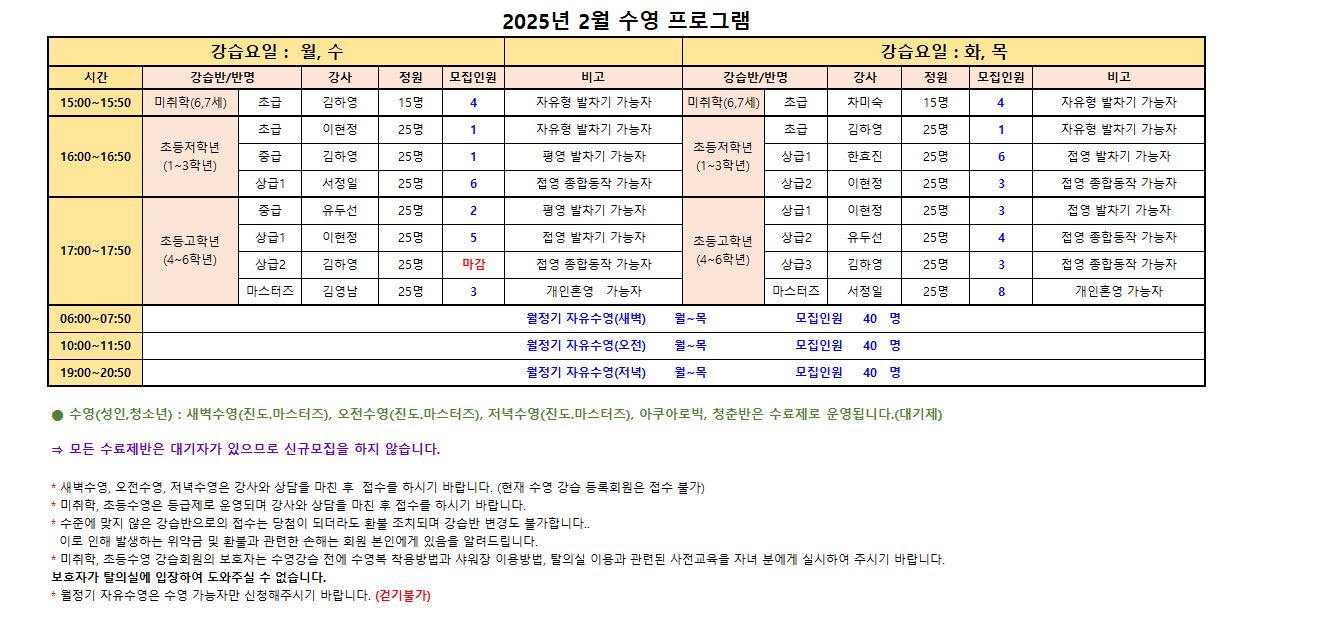 *미취학, 초등수영은 등급제로 운영되며 반드시 강사와 상담을 마친 후 접수를 하시기 바랍니다.