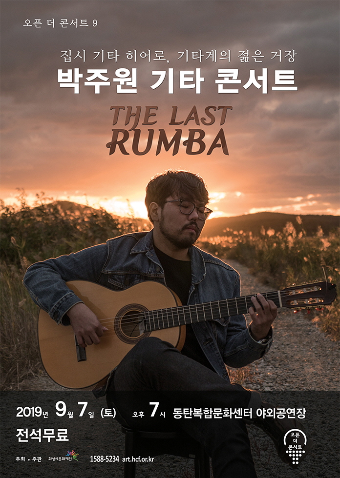 [공지] 공연 장소 변경 안내 - 오픈 더 콘서트 <박주원의 기타콘서트> 작성자 관리자 작성일 2019년 9월 5일 17시 7분 18초 조회 446 (09.07) 오픈더콘서트_박주원기타콘서트.jpg [ Size : 416.69KB, Down : 224 ] 미리보기 다운로드 오픈 더 콘서트 <박주원의 기타 콘서트> 공연 장소 변경 안내- 장소 : 동탄복합문화센터 야외공연장 → 동탄복합문화센터 반석아트홀- 티켓오픈 : 6시 선착순 배부* 티켓배부는 선착순이며 지정좌석으로 배정합니다. 목록보기
