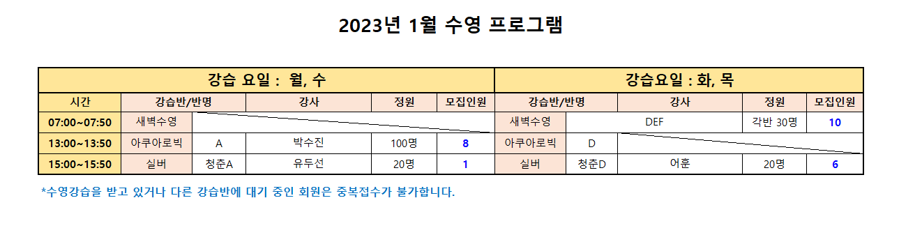 - 수료제 강습반에 대기자가 없을 경우(소진시)에는 신규모집 기간에 신규모집을 진행합니다.
