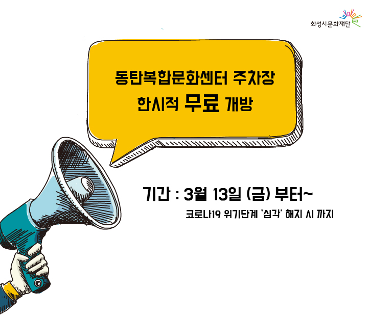 동탄복합문화센터 주차장 한시적 무료개방 안내 작성자 관리자 작성일 2020년 3월 13일 14시 4분 38초 조회 1,912 001.jpg [ Size : 152.41KB, Down : 1,843 ] 미리보기 다운로드 동탄복합문화센터 주차장 한시적 무료개방 안내동탄복합문화센터 주차장을 한시적으로 무료개방함을 알려드립니다. ●기간 : 3월13일 (금)부터 ~ 코로나19 관련 감염병 재난위기경보 '심각' 단계 해지시 까지문의 : 031-8015-8198 목록보기