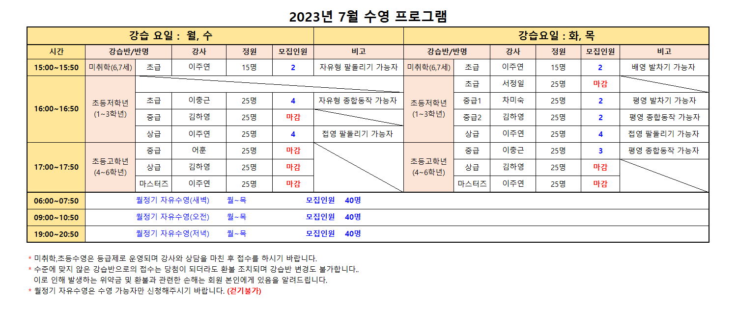수준에 맞지 않은 강습반으로의 신규접수는 당첨이 되더라도 환불 조치되며 강습반 변경도 불가합니다..