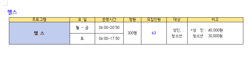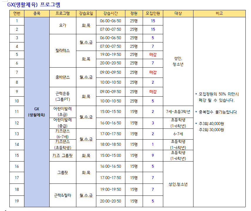 ● 모집프로그램: 수영(미취학.초등저학년.초등고학년, 월정기 자유수영), GX(생활체육), 헬스