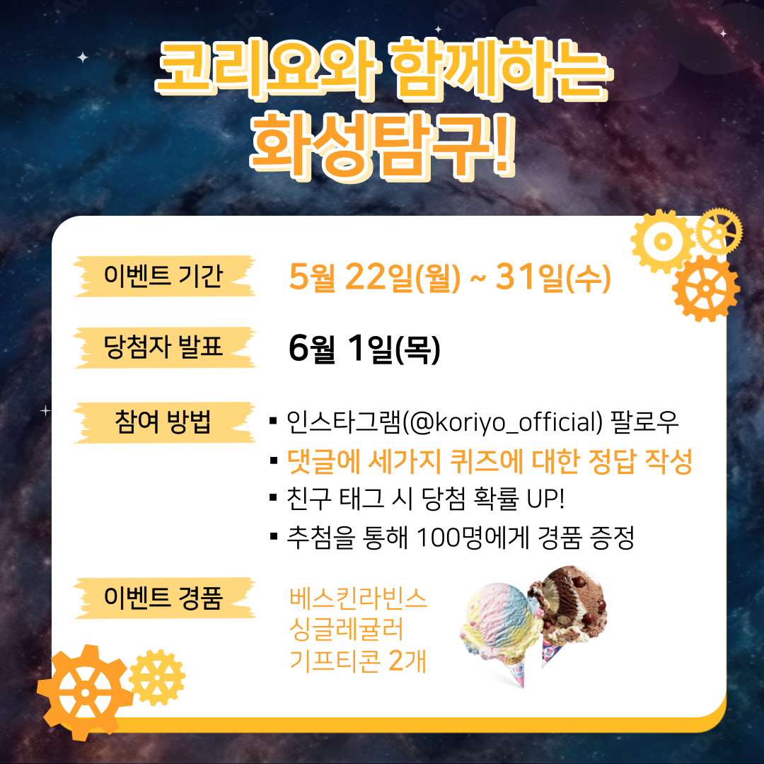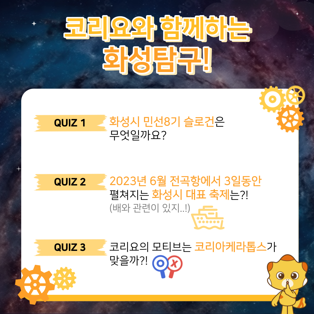 「문화가 있는 날 - 코리요」 화성탐구 SNS 이벤트 안내 작성자 관리자 작성일 2023년 5월 22일 13시 51분 9초 조회 357 5월 코리요 화성탐구1.png [ Size : 851.23KB, Down : 203 ] 미리보기 다운로드 5월 코리요 화성탐구1 5월 코리요 화성탐구2.png [ Size : 607.18KB, Down : 198 ] 미리보기 다운로드 5월 코리요 화성탐구2 5월 코리요 화성탐구3.png [ Size : 659.79KB, Down : 207 ] 미리보기 다운로드 5월 코리요 화성탐구3 목록보기