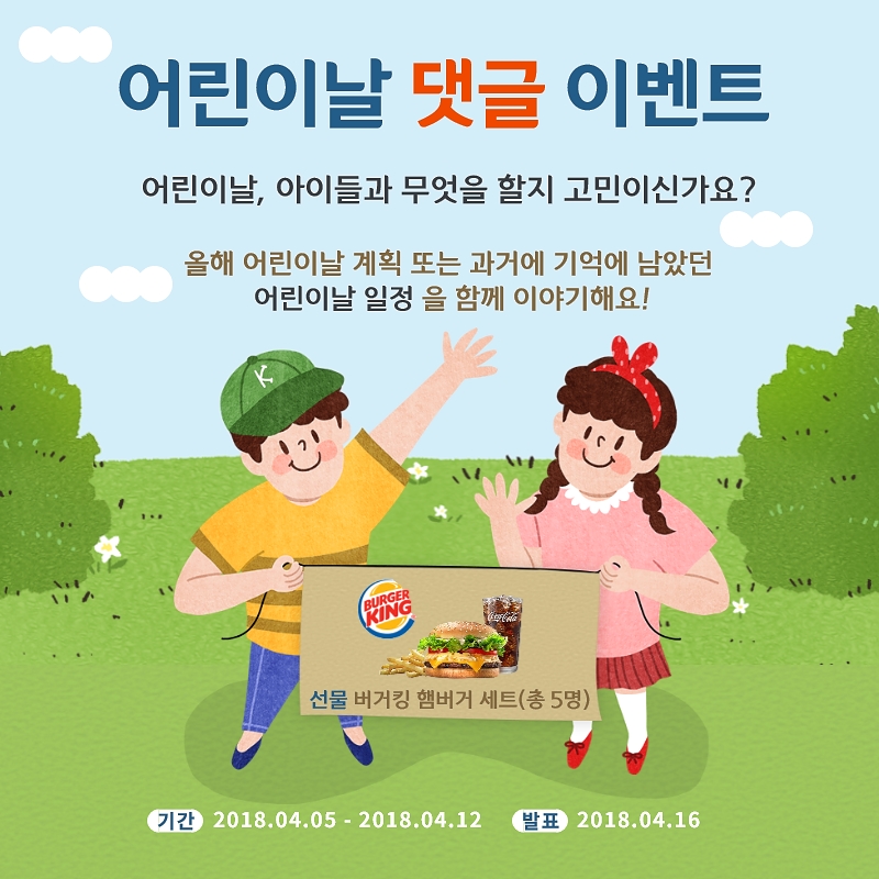 [아트홀] 어린이날 댓글 이벤트 작성자 최선영 작성일 2018년 4월 5일 17시 44분 3초 조회 811 어린이날_댓글_이벤트.jpg [ Size : 359.37KB, Down : 375 ] 미리보기 다운로드 *이벤트기간 : 4월 5일(목) ~ 4월 12일(목)*당첨발표 : 4월 16일(월)*당첨선물 : #버거킹 콰트로치즈와퍼세트 (5명) >> 이벤트 참여하러가기 https://www.facebook.com/hsarthall/photos/a.426212357752139.1073741828.426205214419520/552188658487841/?type=3&theater>> 어린이날 공연 정보 보러가기http://pf.kakao.com/_Mqxixhxl/10450286 목록보기