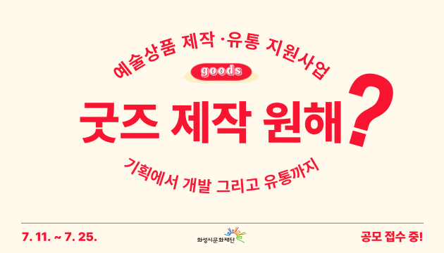 화성시문화재단은 예술인들의 작품을 활용한 아트 굿즈를 제작 유통하여 예술 활동 기반을 넓히고자 <아트 굿즈 제작 및 유통 지원사업>을 공모합니다. 관심있는 예술인들의 많은 지원 바랍니다. |