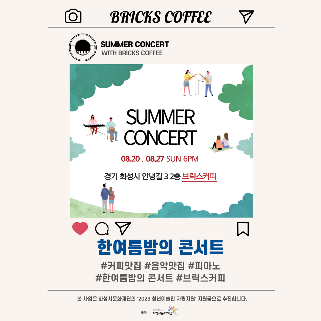 [청년예술인 자립지원] 한여름밤의 콘서트 작성자 관리자 작성일 2023년 8월 21일 15시 37분 50초 조회 871 전가연_인스타그램,_카카오톡_채널_홍보용(정방형)_2023청년예술인자립지원.jpg [ Size : 155.31KB, Down : 758 ] 미리보기 다운로드 전가연_인스타그램,_카카오톡_채널_홍보용(정방형)_2023청년예술인자립지원 -공연명 : 한여름밤의 콘서트-예술인 : 전가연-공연일시 : 2023년 8월 20,27일 (일) 6시-공연장소 : 브릭스커피 (경기 화성시 안녕길 3 2층)-관람정보 : 무더운 여름, 청량한 음악으로 더위를 날려줄 한여름밤의 콘서트 목록보기