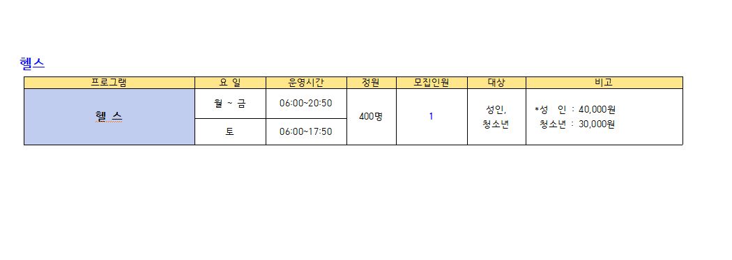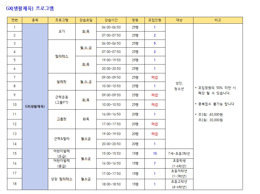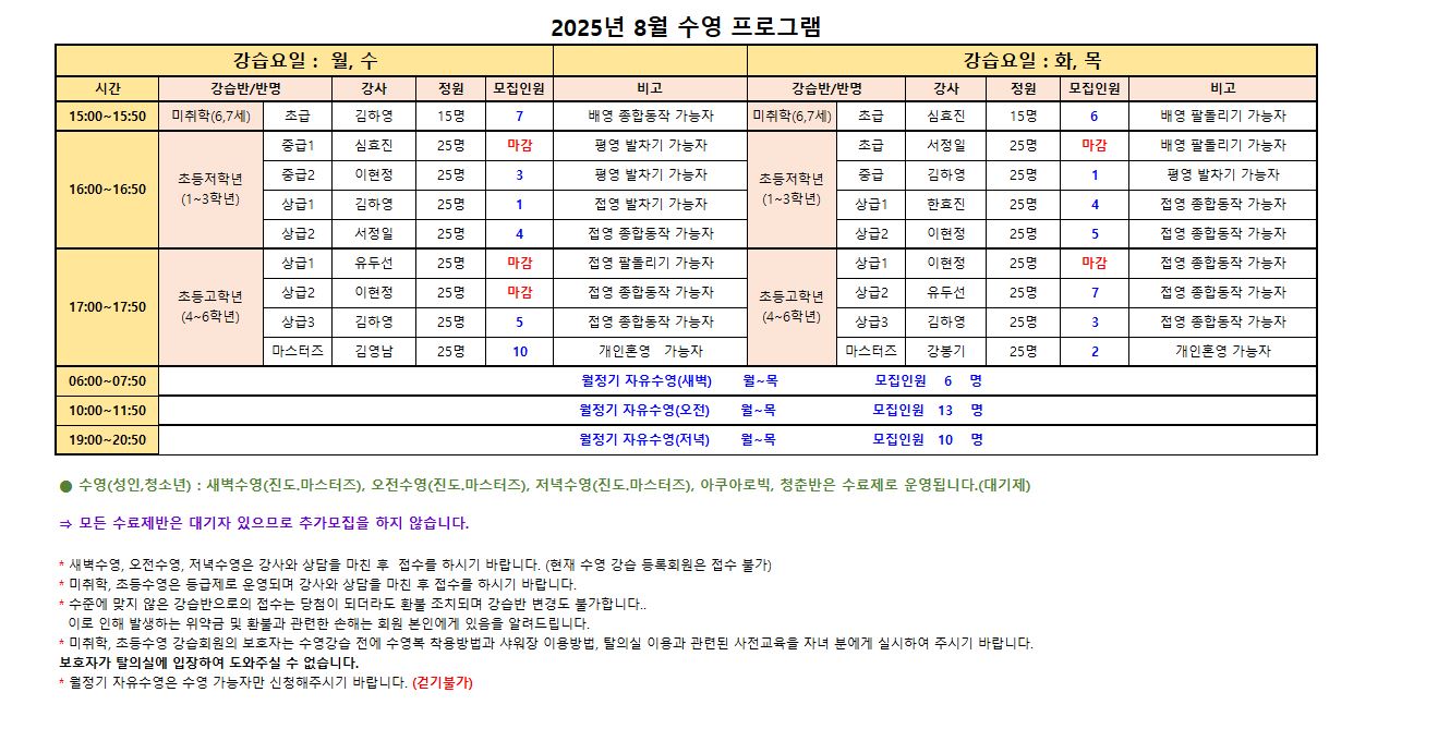 ※수영(성인,청소년) : 새벽수영(진도.마스터즈), 오전수영(진도.마스터즈), 저녁수영(진도.마스터즈), 아쿠아로빅, 청춘반은