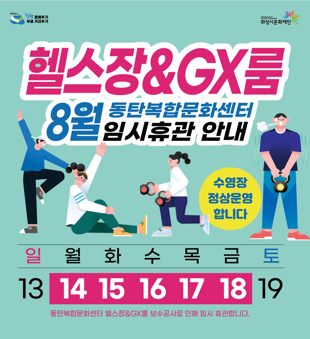 동탄복합문화센터 헬스장 임시휴관 안내 작성자 관리자 작성일 2023년 8월 2일 11시 12분 8초 조회 1,277 230802동복문(최윤성)-8월-헬스장휴관(웹)엘리베이터DID-1080x1180.gif [ Size : 88.45KB, Down : 91 ] 미리보기 다운로드 230802동복문(최윤성)-8월-헬스장휴관(웹)엘리베이터DID-1080x1180 동탄복합문화센터 헬스장 보수공사 관련 임시휴관 안내 -휴관일자 : 2023.08.14(월) ~ 2023.08.18(금)-휴관업장 : 동탄복합문화센터 헬스장-해당종목 : 헬스 및 GX프로그램(9종목) *임시휴관일 5일간의 이용료를 일할 계산하여 환불진행할 예정이오니 스포츠 안내데스크로 방문 부탁드립니다. *수영장은 정상운영 되오니 시설 이용에 참고하시기 바랍니다. -문의 : 031)8015-8171~2 목록보기