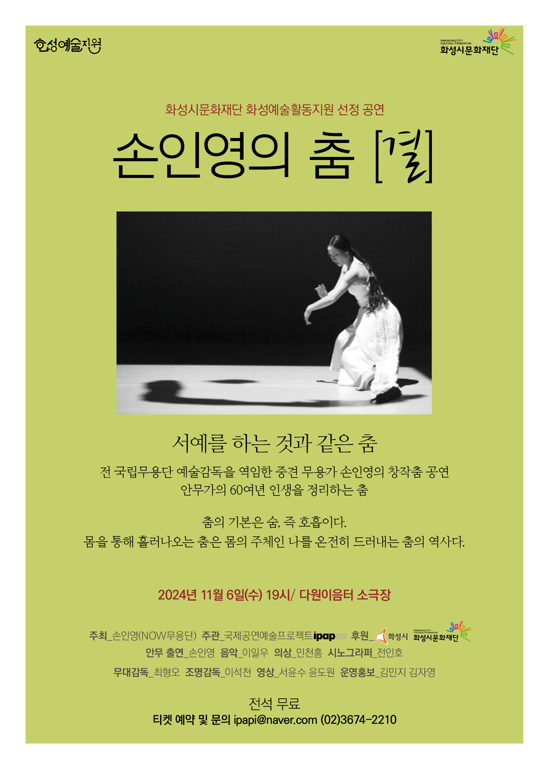 [2024 화성예술활동지원] 11/6(수) 19:00 손인영 - 춤[결] 작성자 관리자 작성일 2024년 10월 11일 16시 3분 39초 조회 406 홍보이미지(손인영).jpg [ Size : 272.5KB, Down : 71 ] 미리보기 다운로드 홍보이미지(손인영) < 2024 화성예술활동지원> 사업 선정작□ 공 연 : 손인영의 춤[결]□ 일 시 : 2024. 11. 6.(수) 19:00□ 장 소 : 다원이음터 소극장□ 예 매 : 전석무료 □ 주 최 : 손인영(NOW무용단)□ 후 원 : 화성시, 화성시문화재단본 공연은 < 2024 화성예술활동지원>에 선정되어 화성시, 화성시문화재단의 후원을 받아 제작되었습니다. 목록보기