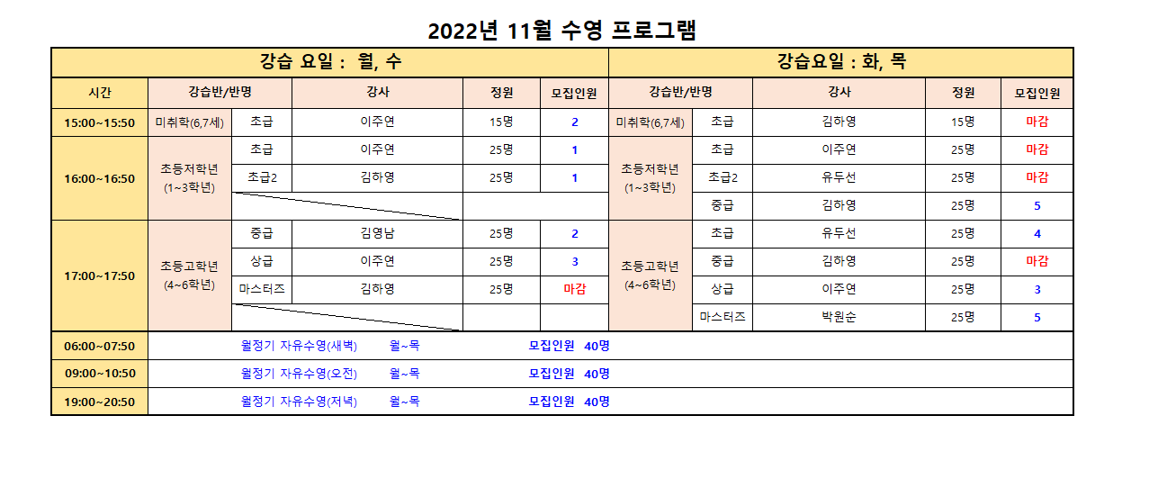 - 수료제 강습반에 대기자가 없을 경우(소진시)에는 신규모집 기간에 신규모집을 진행합니다.