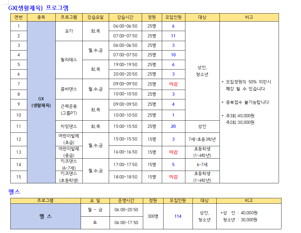 ● 모집프로그램: 수영(미취학, 초등저학년, 초등고학년, 월정기자유수영), GX(생활체육), 헬스