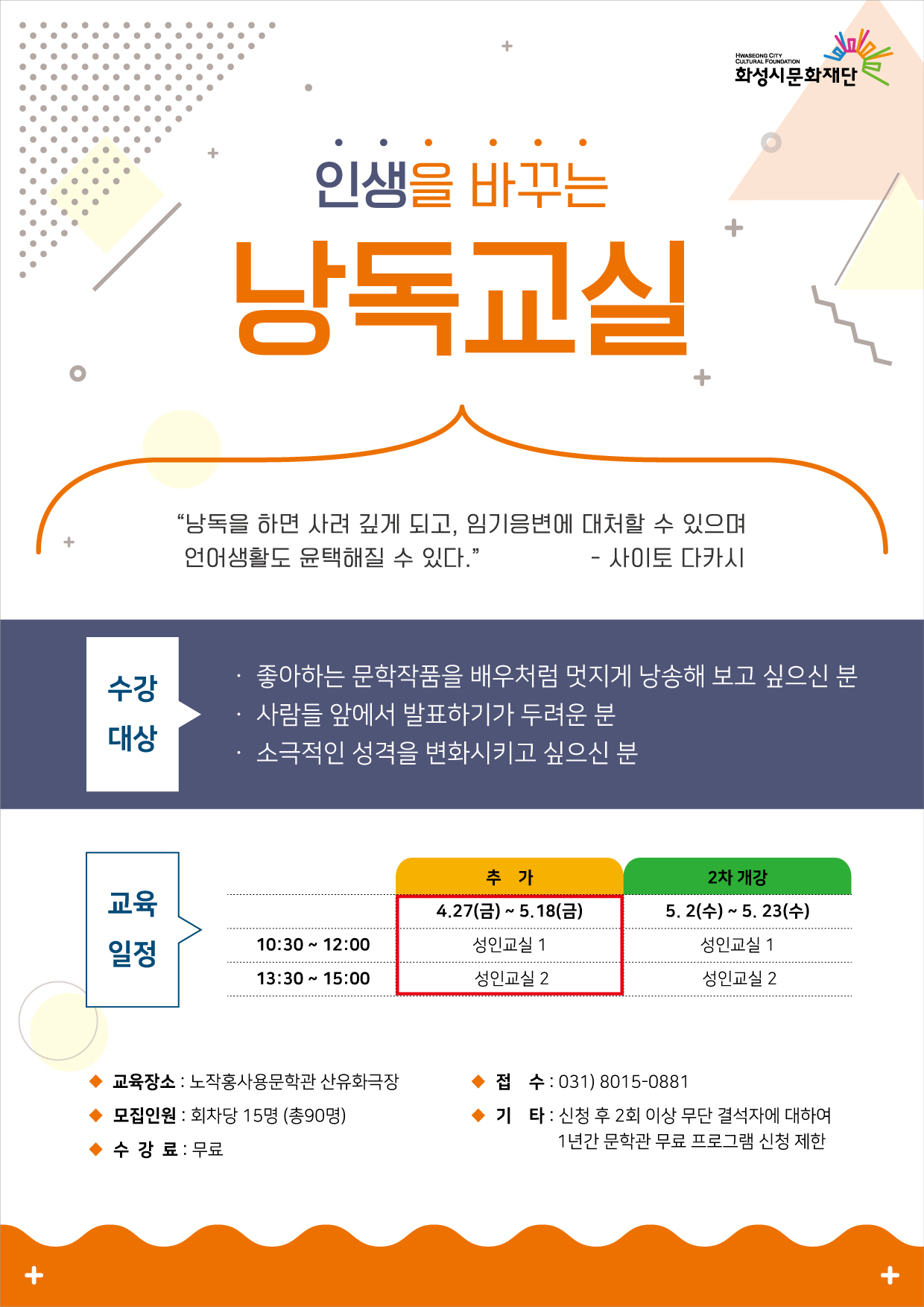 인생을 바꾸는 <낭독교실> 추가모집 안내 작성자 관리자 작성일 2018년 4월 30일 19시 15분 53초 조회 1,060 추가전단(180412)-01-01.jpg [ Size : 537.73KB, Down : 551 ] 미리보기 다운로드 추가전단(180412)-01-02.jpg [ Size : 622.15KB, Down : 410 ] 미리보기 다운로드 목록보기