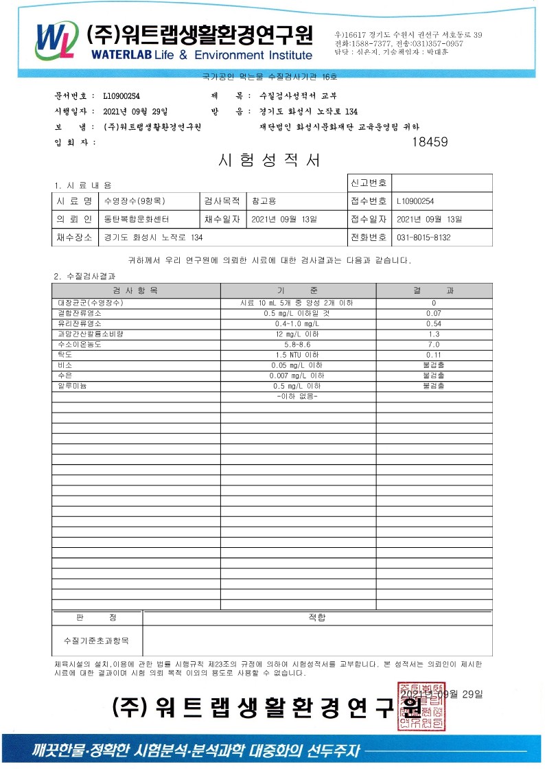 [스포츠] 2021년 9월 동탄복합문화센터 실내수영장 수질검사 성적서 작성자 관리자 작성일 2021년 10월 5일 17시 3분 29초 조회 432 2021년 9월 동탄복합문화센터 수영장 수(水) 검사 성적서.jpg [ Size : 191.13KB, Down : 328 ] 미리보기 다운로드 2021년 9월 동탄복합문화센터 수영장 수(水) 검사 성적서 목록보기