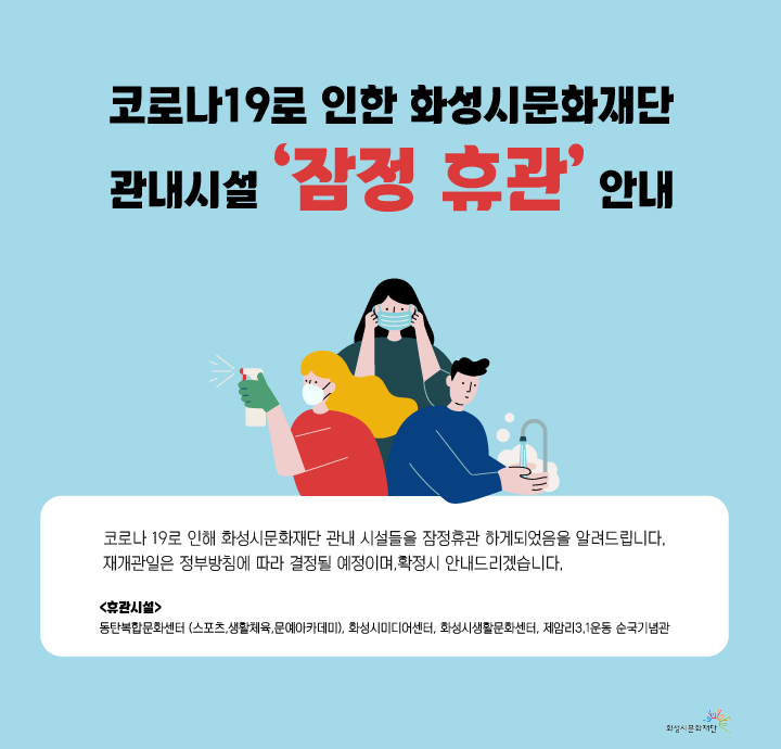 코로나 19로 인한 화성시문화재단 관내시설 잠정 휴관 안내 작성자 관리자 작성일 2020년 3월 24일 14시 5분 9초 조회 1,599 잠정휴관안내.jpg [ Size : 140.06KB, Down : 1,951 ] 미리보기 다운로드 코로나 19로 인해 화성시문화재단 관내 시설들을 잠정휴관 하게되었음을알려드립니다. 재개관일은 정부방침에 따라 결정될 예정이며,확정시 안내드리겠습니다. 목록보기