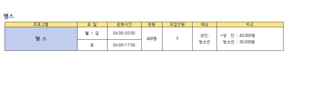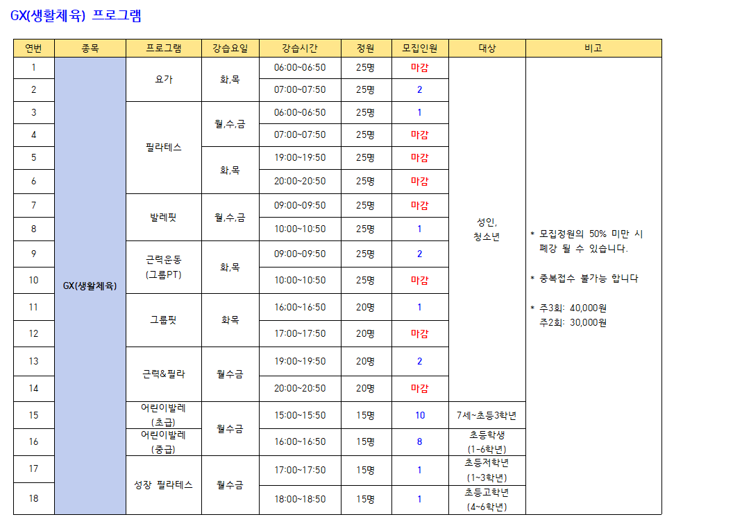 ※수영(성인,청소년) : 새벽수영(진도.마스터즈), 오전수영(진도.마스터즈), 저녁수영(진도.마스터즈), 아쿠아로빅, 청춘반은