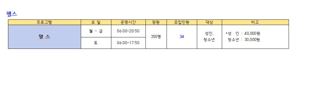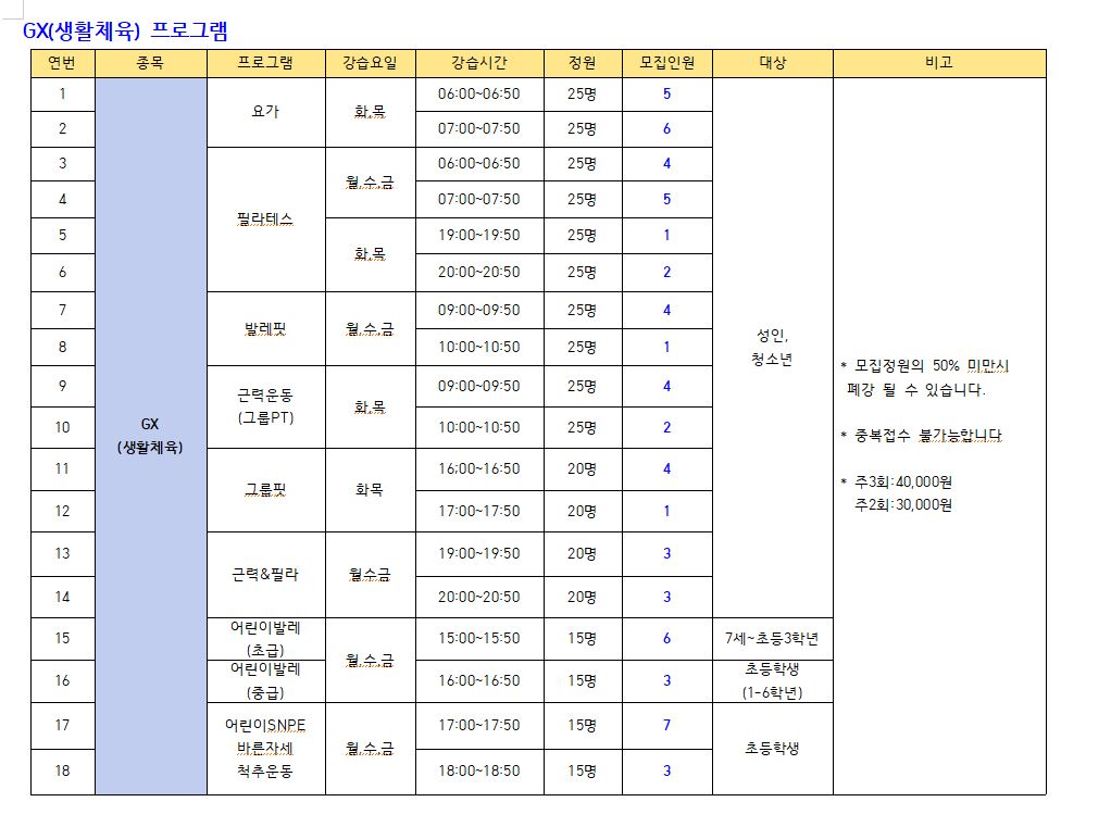 ● 모집프로그램: 수영(미취학. 초등저학년. 초등고학년, 월정기자유수영), GX(생활체육), 헬스