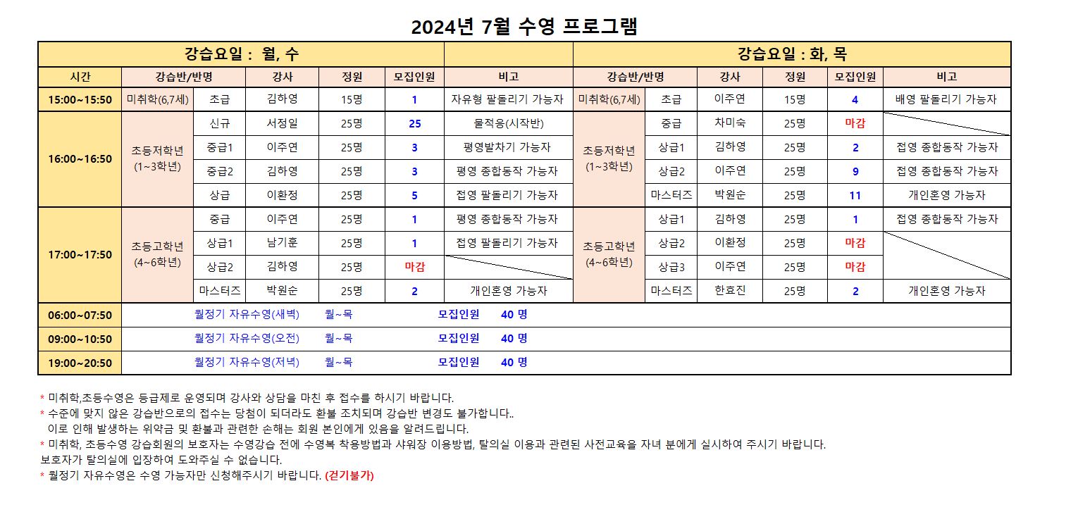 수준에 맞지 않은 강습반으로의 신규접수는 당첨이 되더라도 환불 조치되며 강습반 변경도 불가합니다..