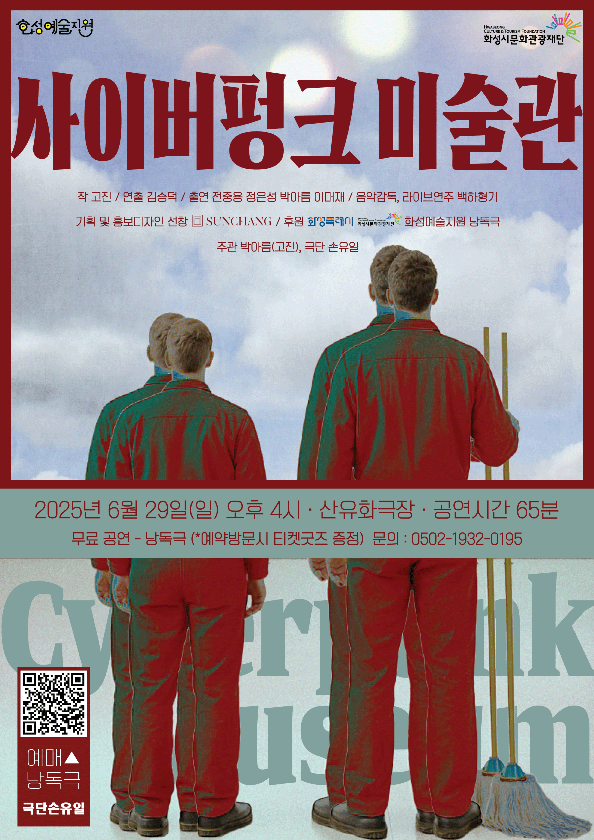 [2025 화성예술활동지원] 6/29(일) 16:00 박아름(극단손유일) - 낭독극 <사이버펑크미술관> 작성자 관리자 작성일 2025년 6월 2일 11시 33분 45초 조회 420 사펑포스터_A2사이즈.gif [ Size : 814.92KB, Down : 62 ] 미리보기 다운로드 사펑포스터_A2사이즈 *** 낭독극 <사이버펑크미술관> ***□ 공연일시 : 2025. 6. 29.(일) 오후 4:00 □ 장 소 : 홍사용문학관 산유화극□ 예매정보 : https://forms.gle/pDijh7ErgLdPs1mK8□ 요금정보 : 무료공연. 사전예매 후 방문시 티켓굿즈 증정□ 공연시간 : 65분(주최/주관) 박아름(극단 손유일)(후원) 화성특례시, 화성시문화관광재단본 공연은 2025 화성예술지원 <화성예술활동지원> 사업 지원을 받아 진행됩니다.< 목록보기