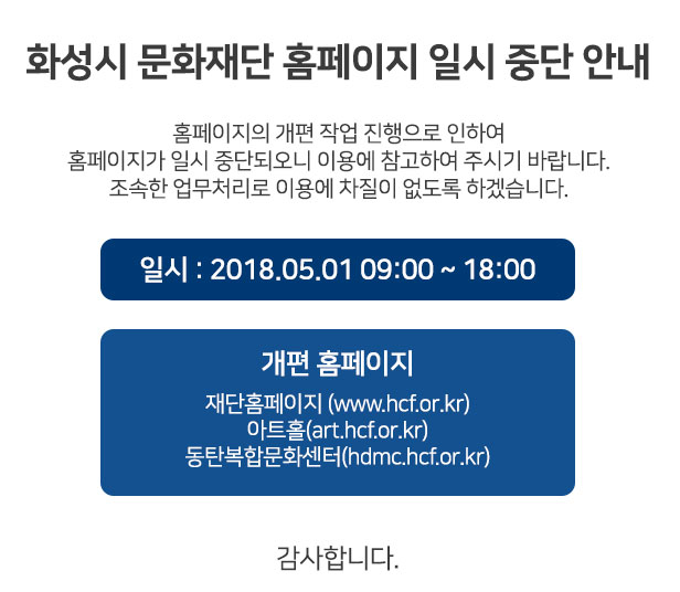 화성시문화재단 홈페이지 일시 중단 안내 작성자 관리자 작성일 2018년 4월 30일 18시 59분 34초 조회 906 Untitled-1.jpg [ Size : 52.27KB, Down : 440 ] 미리보기 다운로드 목록보기
