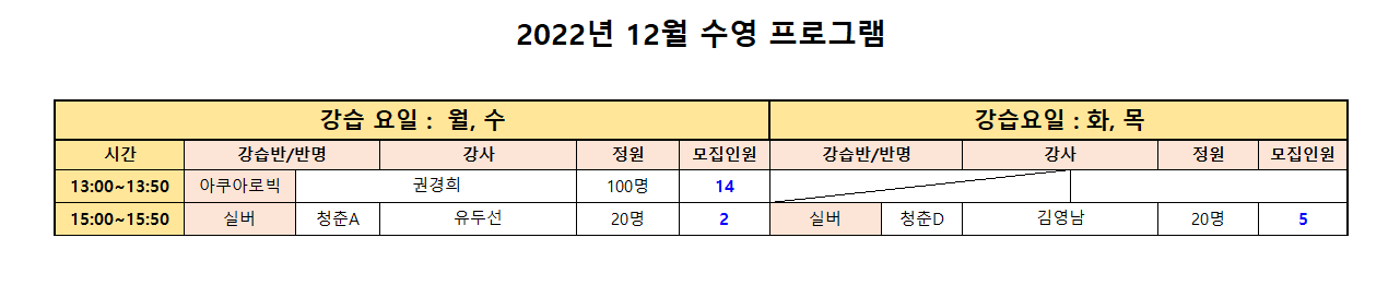 ● 모집반: 아쿠아로빅, 청춘반