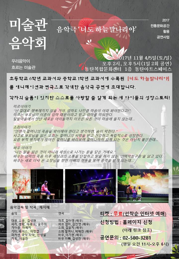 미술관 음악회 <음악극 ‘너도 하늘말나리야’> 공연 안내 작성자 방은지 작성일 2017년 10월 24일 15시 8분 12초 조회 2,048 슬라이드2.JPG [ Size : 140.83KB, Down : 306 ] 미리보기 다운로드 * 공연 신청 : http://gung.or.kr/g/museum/sub03.asp 목록보기