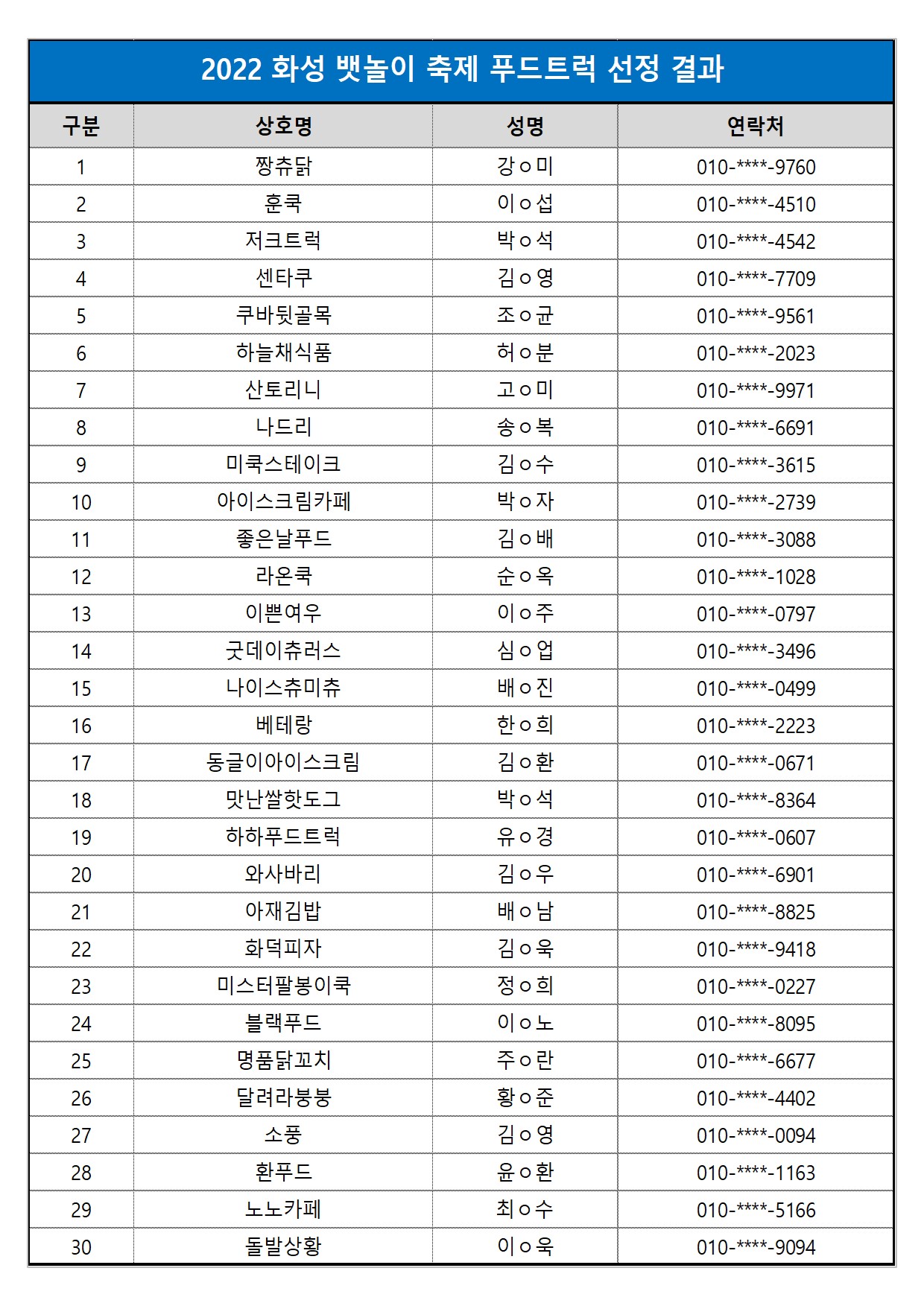 2022 화성 뱃놀이 축제의 푸드트럭 운영 업체로 선정되신 것을 축하드립니다.