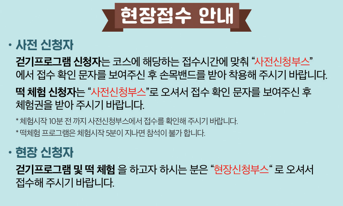 걷기프로그램 및 체험을 하고자 하시는 분은 "현장신청부스"로 오셔서 접수해 주시기 바랍니다.(사전신청마감됨)