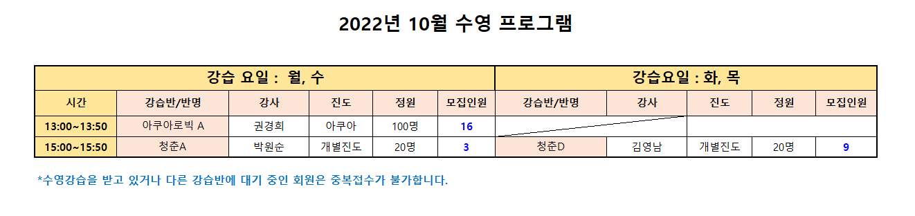 ● 모집반 : 아쿠아로빅(월수). 청춘(월수), 청춘(화목)