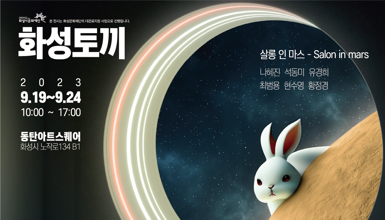 [대관료 지원사업_전시안내] 화성토끼 작성자 관리자 작성일 2023년 9월 15일 9시 57분 53초 조회 512 외벽미디어보드_화성토끼.png [ Size : 1.39MB, Down : 118 ] 미리보기 다운로드 외벽미디어보드_화성토끼 <화성토끼>○ 전시장소 : 동탄복합문화센터 B1 동탄아트스퀘어 (경기 화성시 노작로 134)○ 전시기간 : 2023. 9. 19.(화)~ 2023. 9. 24.(일)○ 무료전시* 화성시문화재단 대관료 지원사업 지원을 받아 진행됩니다* ○ 화성시민여러분의 많은 관람 부탁드립니다. 목록보기