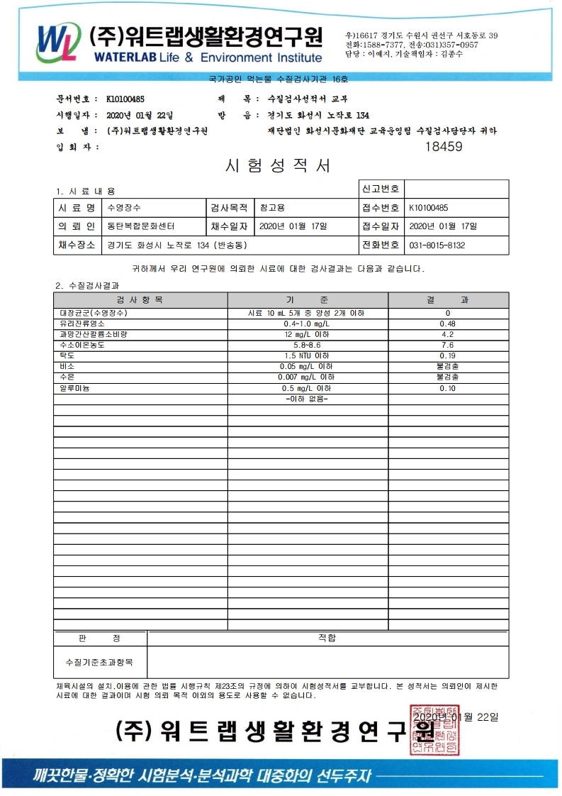 [스포츠] 2020년 1월 동탄복합문화센터 실내수영장 수질검사 성적서 작성자 관리자 작성일 2020년 2월 4일 9시 54분 10초 조회 444 2020년 1월 동탄복합문화센터 수영장 수(水) 검사 성적서.jpg [ Size : 401.28KB, Down : 85 ] 미리보기 다운로드 목록보기