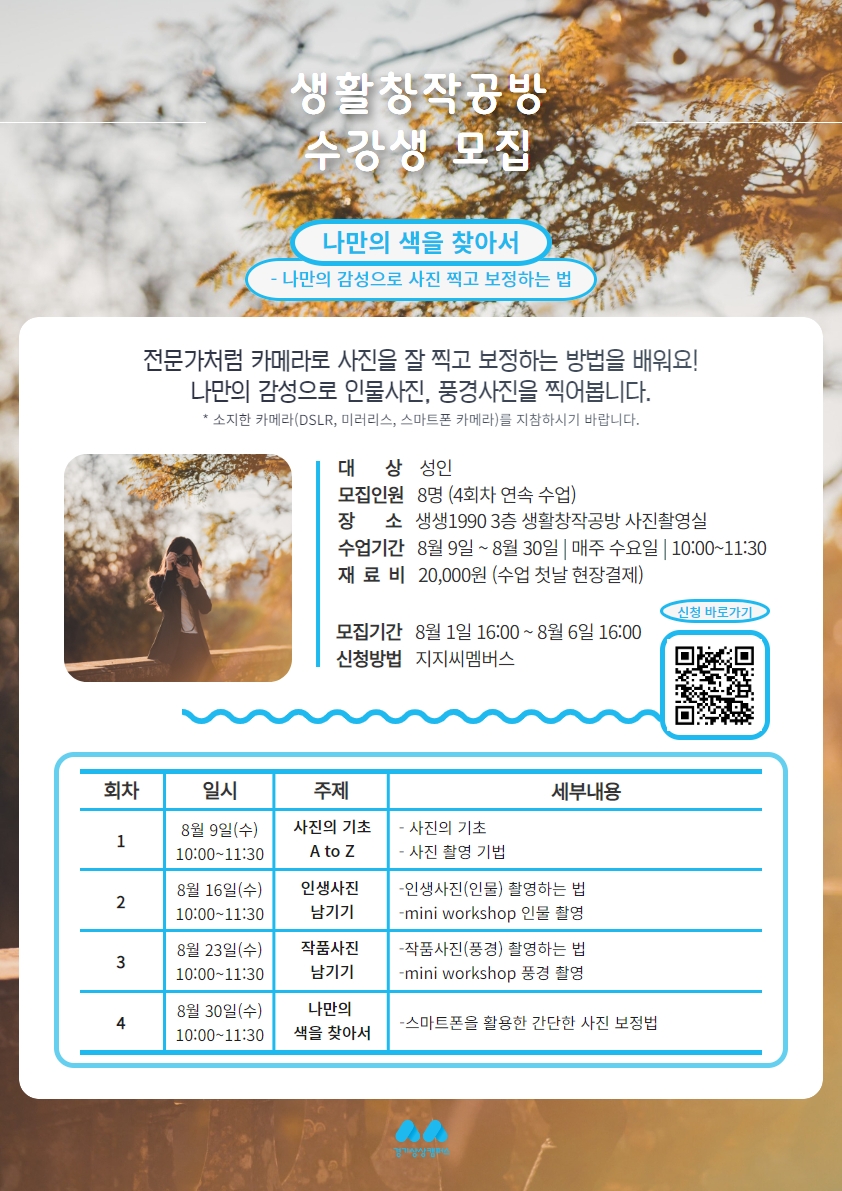 1 | 사진촬영실 | 나만의 색을 찾아서 | 8. 9.(수) ~ 8. 30.(수) | 나만의 감성으로 사진을 찍고 보정하는 법, 인생사진 만들기 |