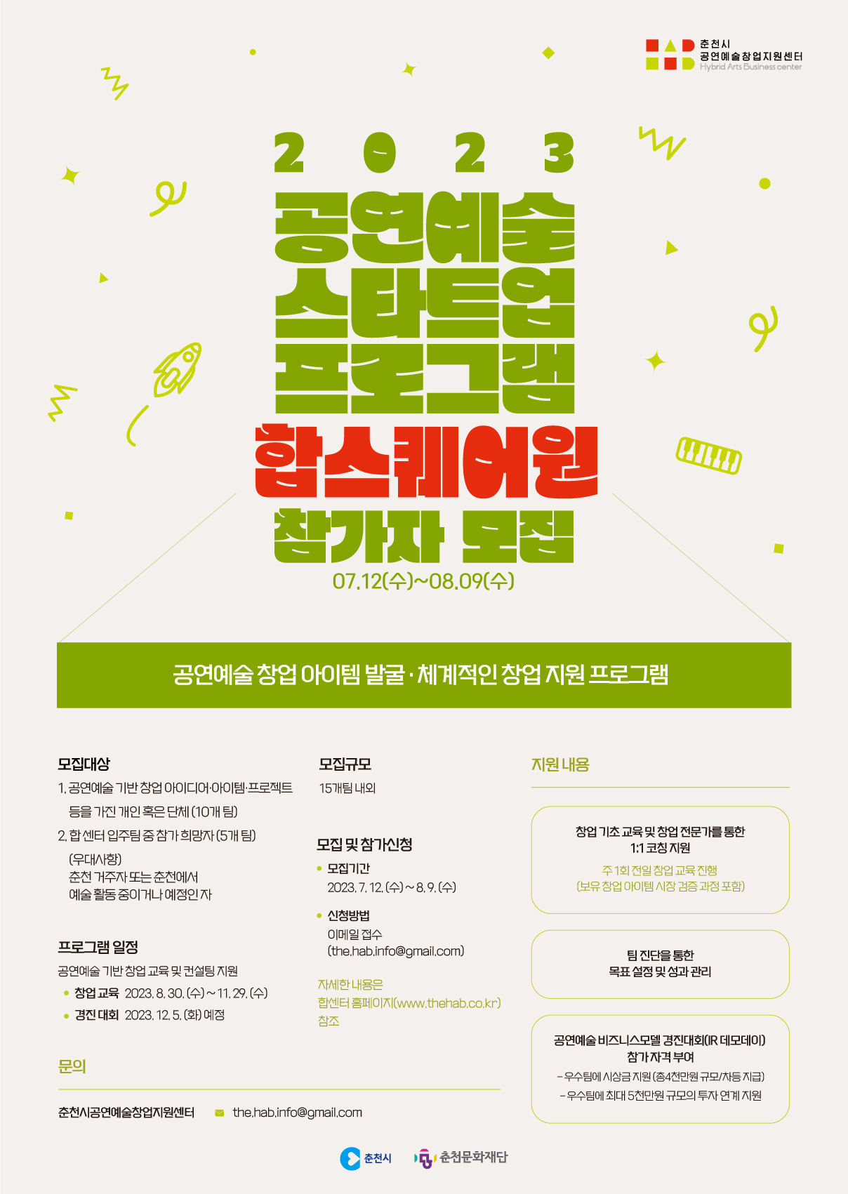 신청방법 | 춘천시공연예술창업지원센터 홈페이지 (www.thehab.co.kr) | 이메일 접수 (the.hab.info@gmail.com) |