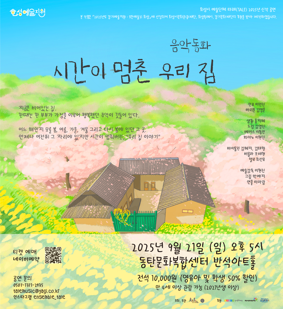 화성예술지원 화성시 예술단체 타래 2025년 신작 공연 본 작품은 「2025년도 경기예술지원 : 모든예술31 화성」에 선정되어 화성시문화재단, 화성특례시, 경기문화재단의 후원을 받아 제작되었습니다. 음악동화 시간이 멈춘 우리 집 지금은 비어있는 집, 한때는 한 부부가 가정을 이루어 행복했던 추억이 깃들어 있던 집. 어느 해였는지 모를 봄, 여름, 가을, 겨울 그리고 다시 봄에 있던 그 곳. 언제나 여전하던 그 자리에 있지만 시간이 멈춰버린 “우리 집 이야기” 출연진 민요 이민진 바리톤 김영훈 생황 홍지혜 드럼 김영진 베이스 이동민 피아노 이현진 바이올린 김혜지, 김태형 비올라 조재현 첼로 최선유 예술감독 이현진 그림 박예지 연출 이아람 2025년 9월 21일 (일) 오후 5시 동탄문화복합센터 반석아트홀 전석 10,000원 (영유아 및 학생 50% 할인) 만 4세 이상 관람 가능 (2021년생 이상) 티켓 예매 네이버 예매 공연 문의 0507-1371-2935 talemusic@yagi.co.kr 인스타그램 ensemble_tale 2025년 9월 21일(일) 오후 5시 동탄복합문화센터 반석아트홀 전석 10,000원 (영유아 및 학생 50% 할인) 만 4세 이상 관람 가능 (2021년생 이상) 주최, 주관 타래 후원 경기문화재단 화성시문화관광재단 화성특례시