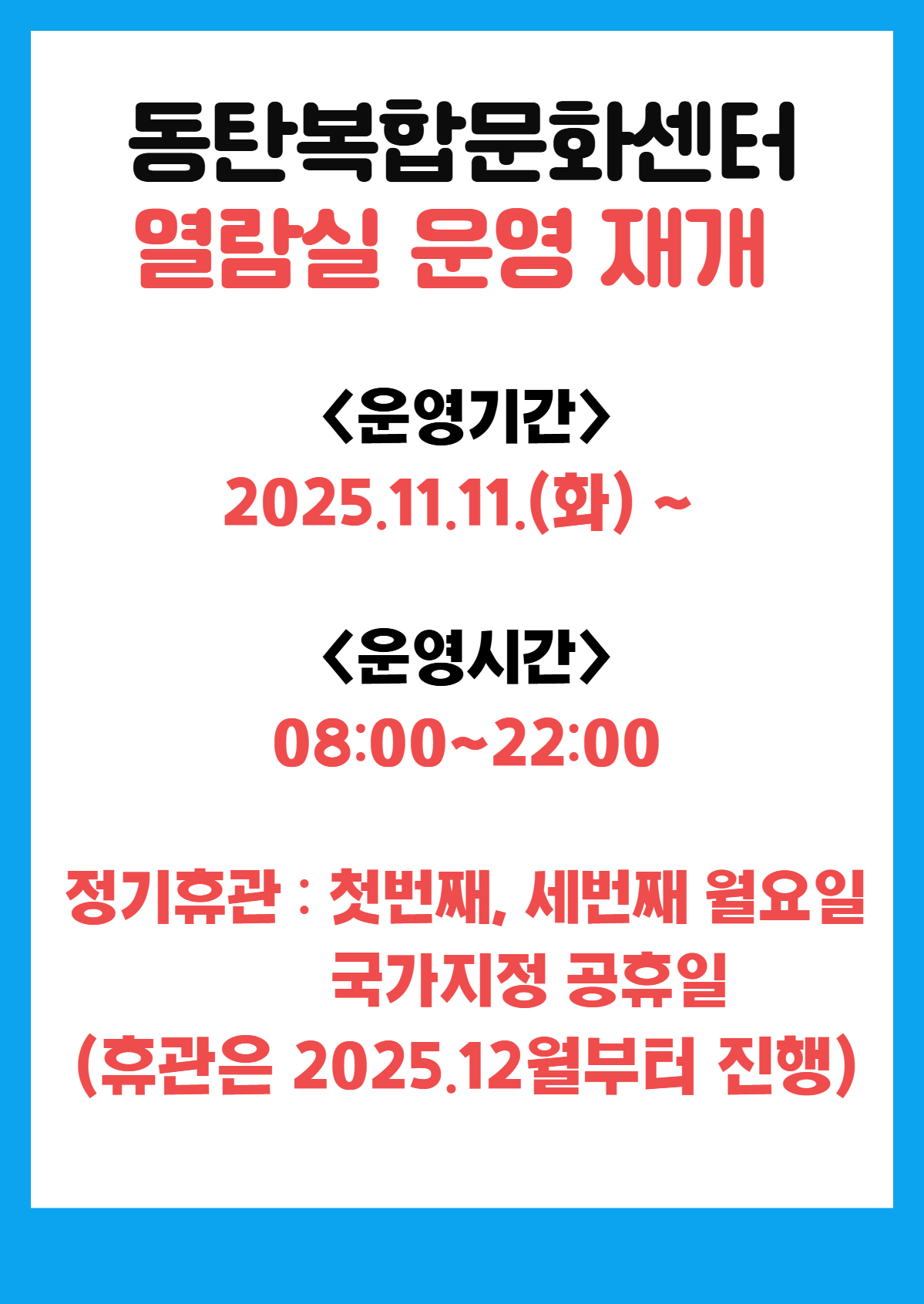 공지 동탄복합문화센터 열람실 운영 재개 작성자 관리자도서관 작성일 2025년 11월 11일 13시 41분 53초 조회 350 열람실 휴관.jpg [ Size : 477.6KB, Down : 64 ] 미리보기 다운로드 열람실 휴관 목록보기