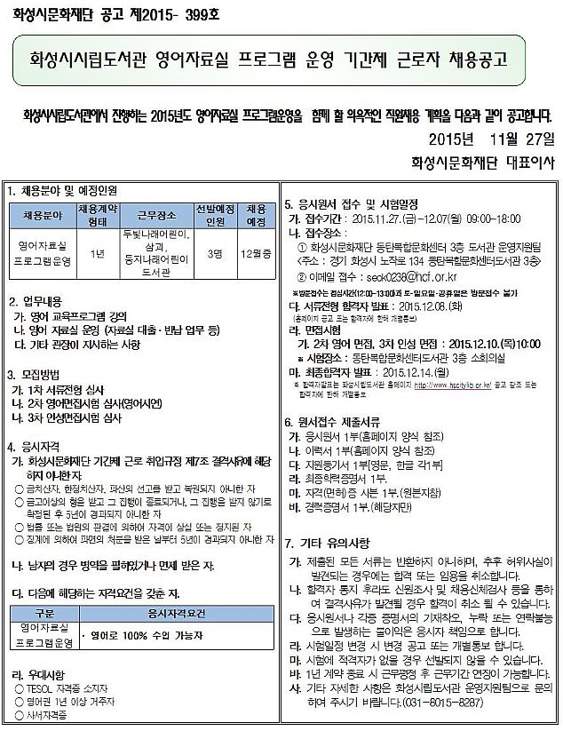 화성시시립도서관에서 진행하는 2015년도 영어자료실 프로그램운영을 함께 할 의욕적인 직원채용 계획을 다음과 같이 공고합니다.