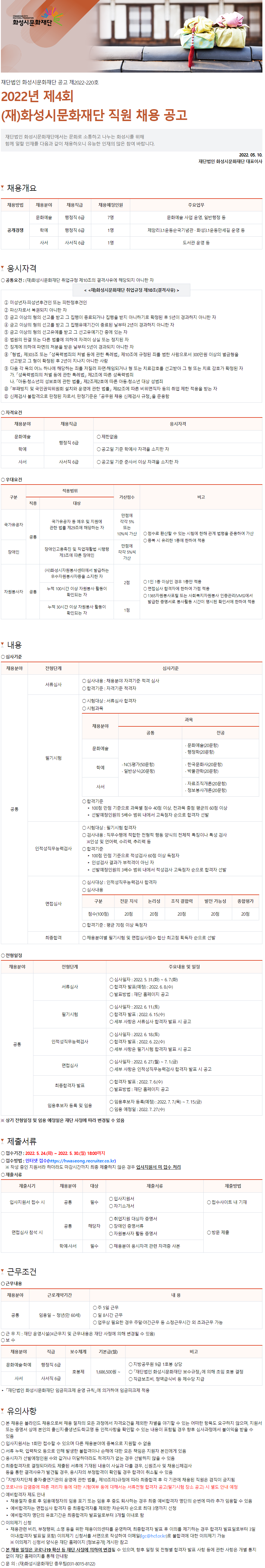 2022년 제4회 (재)화성시문화재단 직원 채용 공고