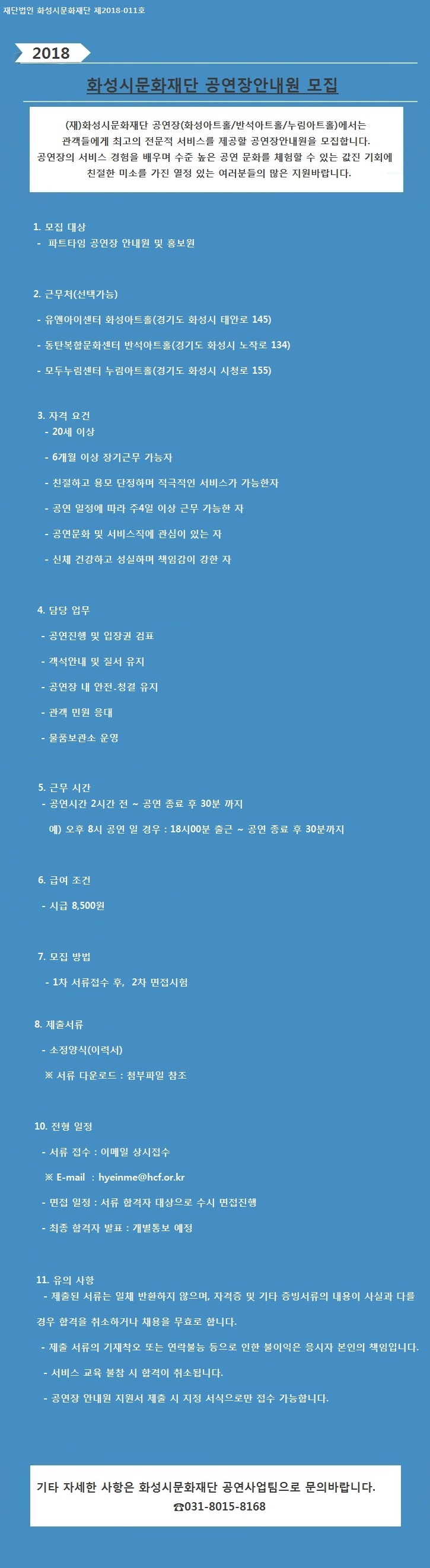 (재)화성시문화재단 공연장 안내원 모집 작성자 ADMIN 작성일 2018년 1월 8일 13시 23분 36초 조회 1,150 사본_-화성시문화재단_공연장안내원_모집.jpg [ Size : 270.59KB, Down : 218 ] 미리보기 다운로드 공연장안내원_지원서양식.hwp [ Size : 17KB, Down : 688 ] 다운로드 목록보기