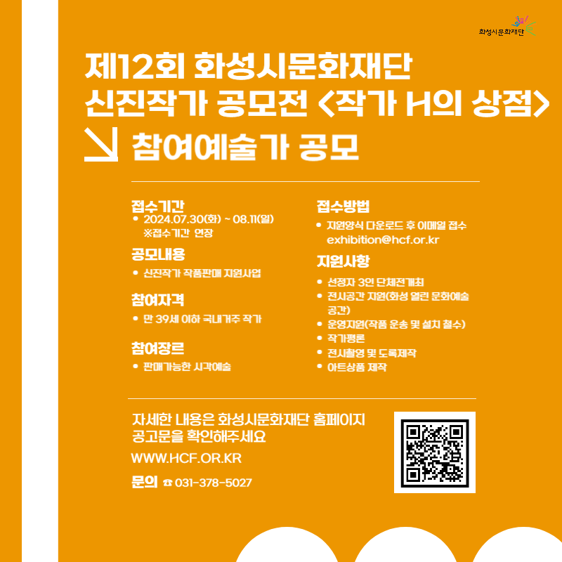 (재)화성시문화재단에서 아래와 같이<작가 H의 상점(신진)> 참여예술가를 공모하고자 하오니 유능한 인재의 많은 응모 바랍니다.