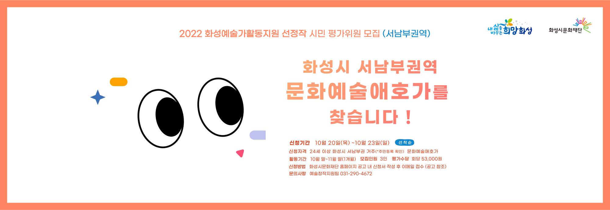 2022 화성예술가활동지원 서·남부권역 시민평가위원 추가모집 공고 |