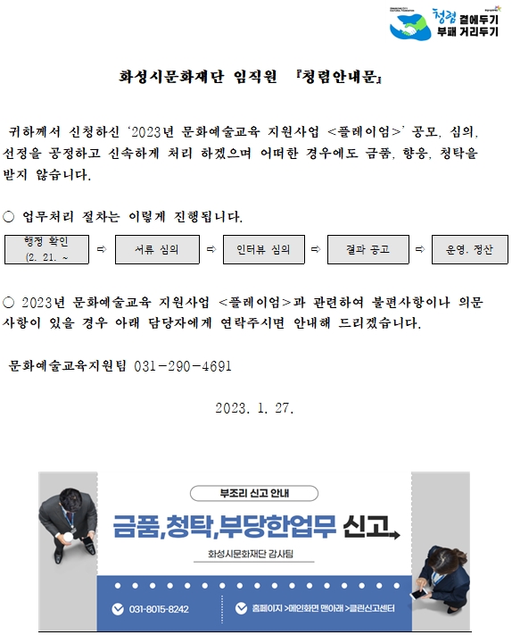 화성시문화재단은 다양하고 창의적인 문화예술교육을 응원하고 예술가를 통한 예술교육을 실현하기 위한 일상 속 문화예술교육 프로그램 <플레이엄 ; PLAY+MUSEUM>을 지원합니다. 문화예술교육에 관심있는 예술인, 단체(그룹)의 많은 지원 바랍니다. |